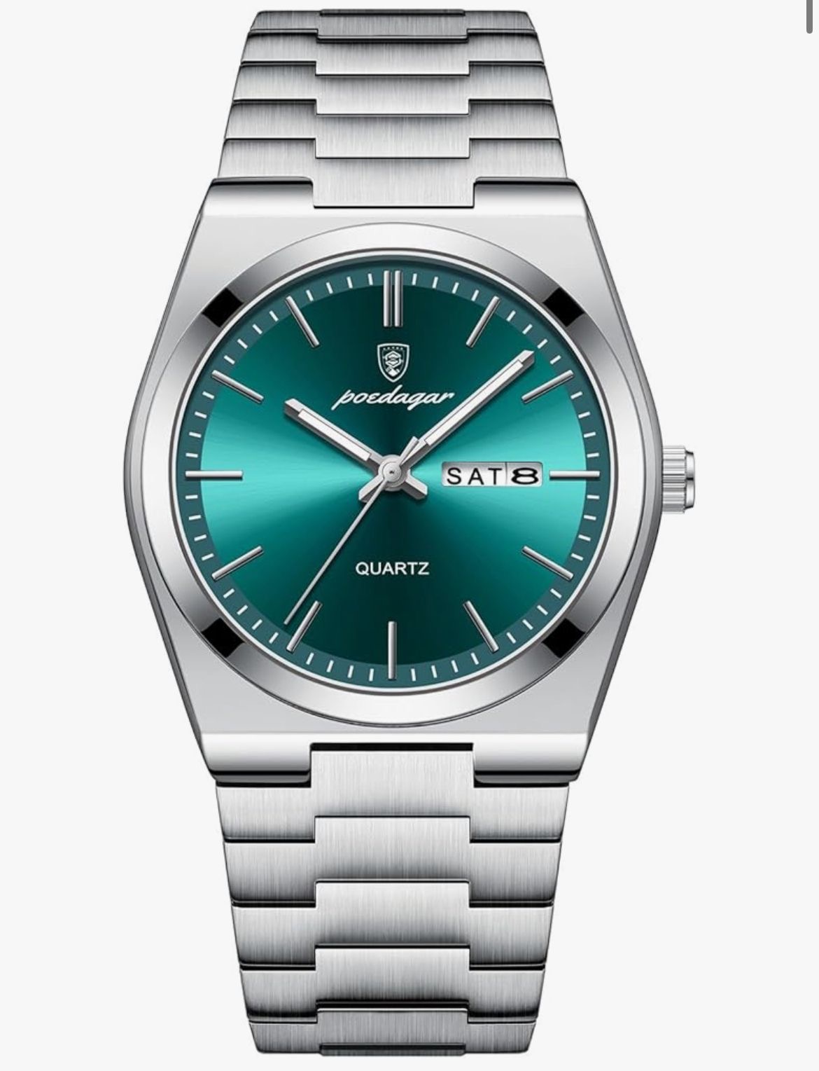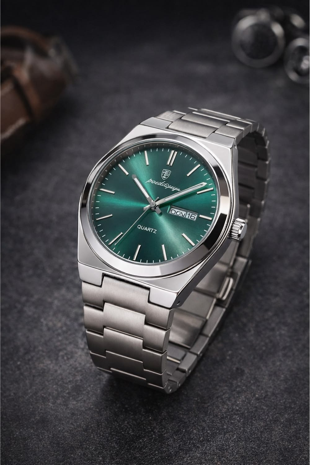 This isn't just a watch - this is a statement piece. That green and blue sunburst dial, the clean minimalist markers, and the full stainless steel finish instantly give off a luxury executive vibe. it's the kind of watch that quietly says: