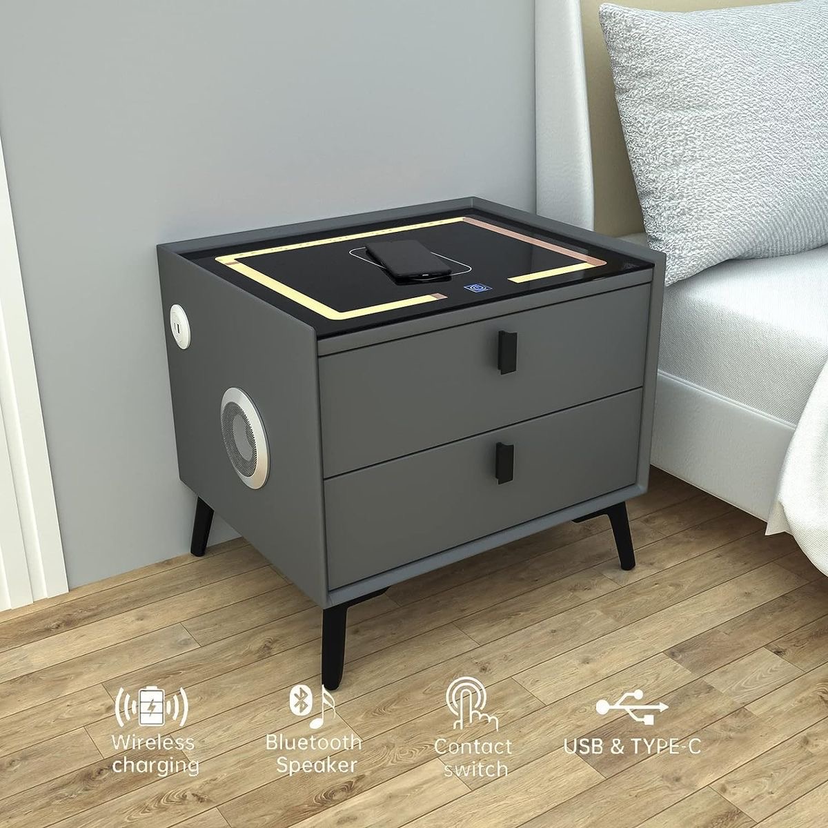 → Replaces 5 Products in 1 — Nightstand + phone charger + Bluetooth speaker + bedside lamp + mini safe. One purchase saves you money on all five.